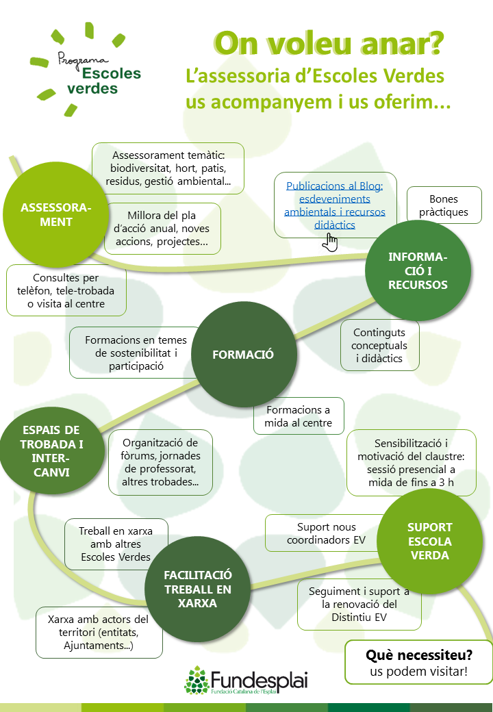 Per a qualsevol qüestió urgent, podeu contactar amb Fundesplai (667 17 22 80) o amb la coordinació de la Xarxa Escoles Verdes (escolesverdes@gencat.cat)
