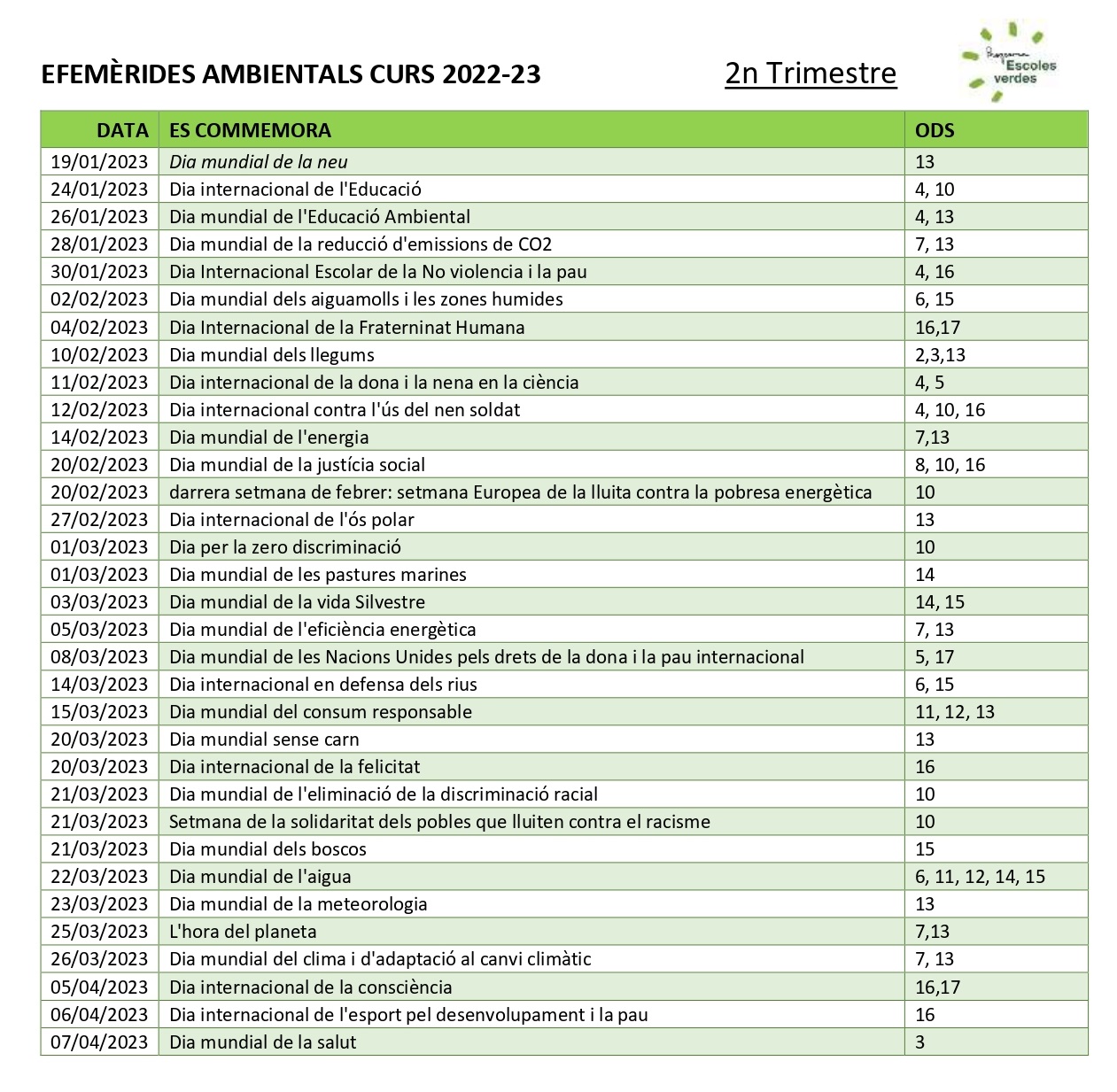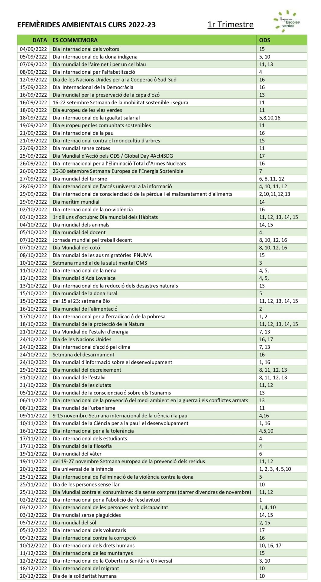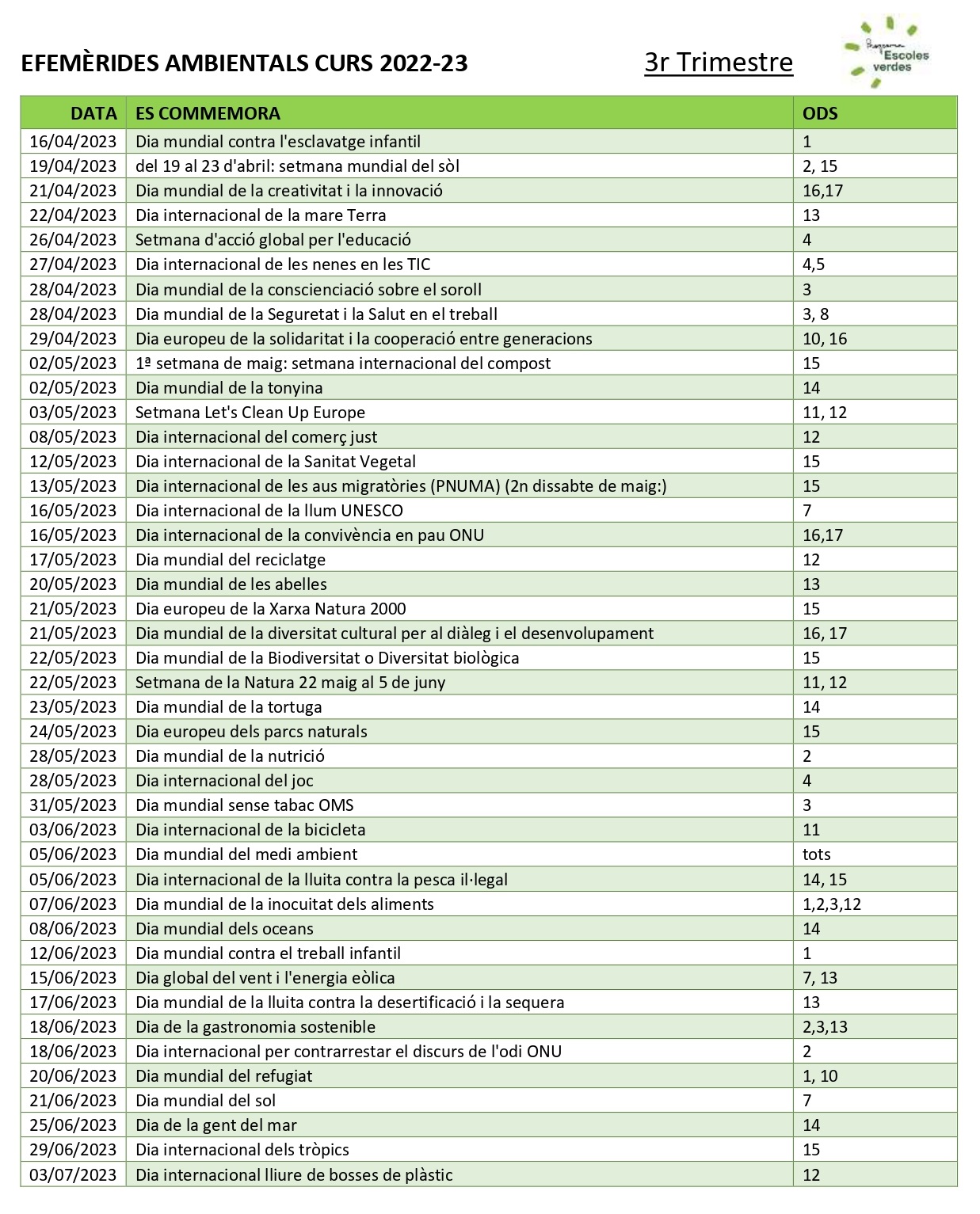Descarregueu el calendari d'esdeveniments ecosocials i ambientals en format .pdf o .xls CALENDARI ESCOLAR EFEMÈRIDES ECOSOCIALS I AMBIENTALS